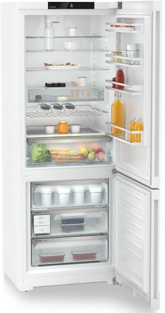 Liebherr CNd 7723 — двухкамерный холодильник высотой 201 см с нижним морозильным отделением. Модель относится к технике с динамическим охлаждением и системой NoFrost в морозильной камере. Конструкция ориентирована на равномерное распределение холода, стабильную работу и длительное хранение продуктов без перепадов температуры. Конструкция и внутренняя организация Ширина и глубина соответствуют стандартным размерам (60 × 67 см), а увеличенная высота позволяет получить большой полезный объём без изменения общей планировки кухни. Дверцы открываются плавно, уплотнители фиксируются по контуру и сохраняют герметичность при частом использовании. Холодильное отделение оснащено полками из закалённого стекла. Каждая полка выдерживает значительную нагрузку и может устанавливаться на разную высоту. Под ними расположены два контейнера для овощей и зелени: их конструкция помогает поддерживать повышенную влажность, а направляющие обеспечивают плавное выдвижение. В морозильном отделении три выдвижных