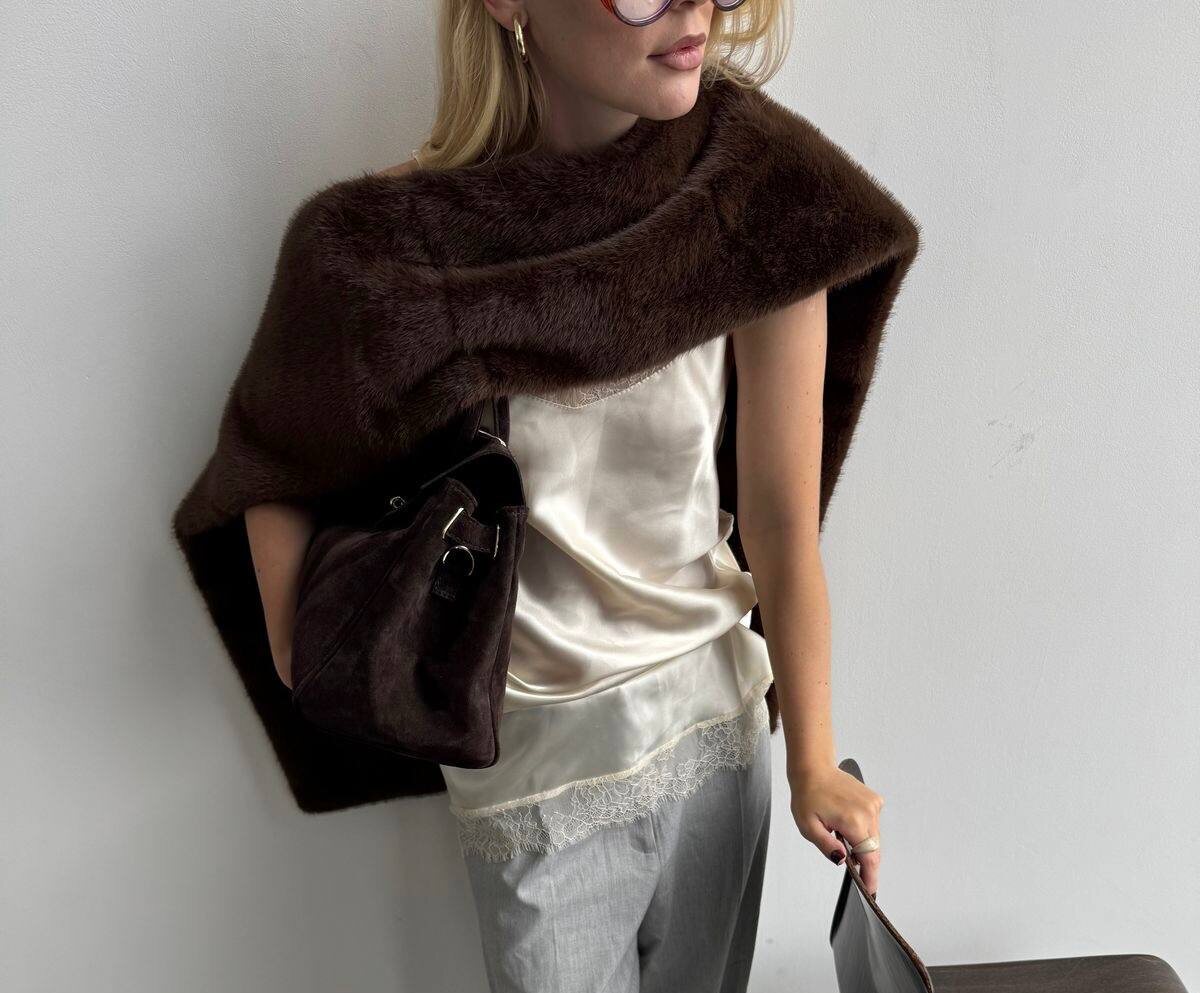 Жакет с юбкой или брюками с дополняющими аксессуарами в виде того же мехового шарфа или сумочки-кисета с сатиновым эффектом (как в Zarina)