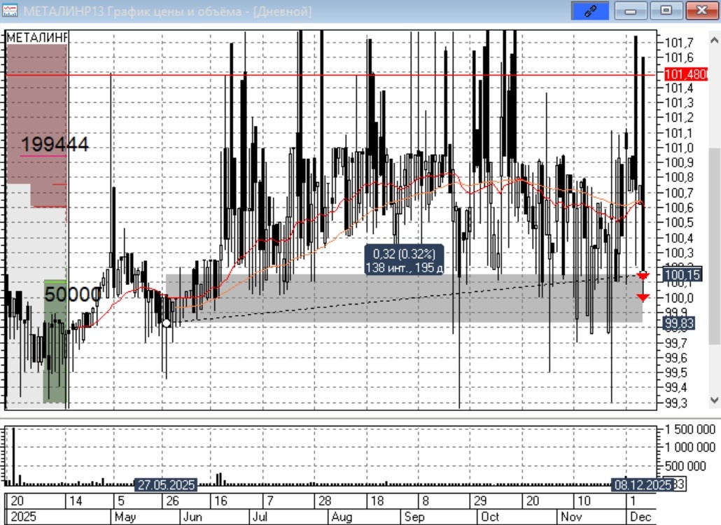 Монополия объявила технический дефолт по облигациям МОНОП 1P02, купоны были выплачены, а погашения облигаций 04.12.25 не проведено. Это привело сначала к падению цены по всем выпускам облигаций от МОНОП 1P03 до МОНОП 1P07. Мы в сентябре при ребалансировке портфеля продали все выпуски, но этот дефолт вызвал в понедельник коррекцию по облигациям других эмитентов. Сбер опять, как ранее по тейк-профитам по акциям допускал проскальзывание, закрывая ордер далеко от выставленного тейк-профита, так и сегодня допустил проскальзывание по облигациям МЕТАЛИНP13 (RU000A10B4D8, ААА), тейк был выставлен по цене 101,48, а Сбер закрыл ордера по нисходящей шпильке. В итоге, вместо 1,5% профита, только 0,3%. Раньше пытались обращаться к брокеру по таким ошибкам терминала, но получали только отписки. Далее мы начали закрывать сделки по облигациям, который пошли вниз. Закрыли сделку по ЭЛРЕШ 1Р2 (RU000A10D1J9, кредитный рейтинг ВВВ), годовой купонный доход 22,5%. Бумагу брали под рост цены, в связи с ее к