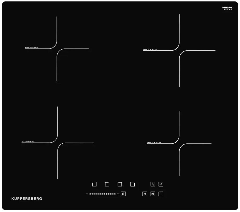 Kuppersberg ICS 607 — компактный варочный блок шириной 60 см с четырьмя индукционными зонами. Модель рассчитана на повседневную готовку и даёт быстрый нагрев, точный контроль мощности и удобное управление без лишних функций. Поверхность выполнена из стеклокерамики: она выдерживает высокие температуры рядом с посудой и остаётся относительно холодной вне рабочей зоны — свойство индукции снижает риск случайных ожогов и упрощает уборку. Конструкция и рабочие зоны На плите четыре конфорки стандартного диаметра. Две из них — передняя правая и задняя правая — образуют объединяемую область. Это удобно, если хочется использовать продолговатую посуду: утятницу, гриль-пластину или сковороду с нестандартным дном. Каждая зона снабжена собственным датчиком контроля температуры, поэтому поверхность корректно определяет размер посуды и подаёт мощность только под рабочую площадь. Стеклокерамическая панель тёмного оттенка с минимальной разметкой: обозначены контуры зон и сенсорные пиктограммы. Выгляди