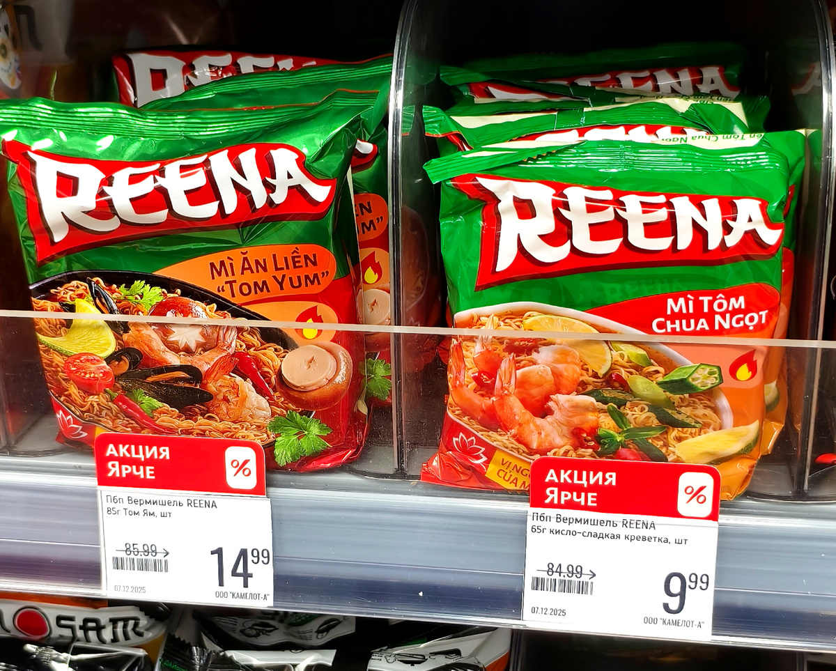 Всем привет! Попал в Ярче на суперакцию. Вьетнамская лапша Reena томям и кисло-сладкая креветка за копейки. ТомЯм я уже покупал на обзор в Дикси за 85 рублей. Тогда я ещё думал, что за 50 рублей было бы идеально. А вот за 14,99 эта лапша это подарок судьбы, вне конкуренции в общем). Сегодня буду пробовать кисло-сладкую креветку.А она вообще всего за 9,99р. Надеюсь она чем-то отличается от томяма. В составе пшеничная лапша, суповая основа с сушеными креветками, зелёным луком и перцем чили, а также ариправочное ароматизированное почтительное масло. Лапша изготовлена во Вьетнаме. Импортер: ООО "Сэлтикс Сиберия", г. Новосибирск. Способ приготовления классический. Масса, кстатии, всего 65 граммов. Порция небольшая, лучше брать сразу две упаковки. В комплекте брикет лапши. И два пакетика с добавками. Масло ароматное. Наверняка в нем есть какой-то рыбный ароматизатор. Вот такой супец получается. Простой и незамысловатый. Бульон, действительно, со сладко-кислым вкусом. Есть п