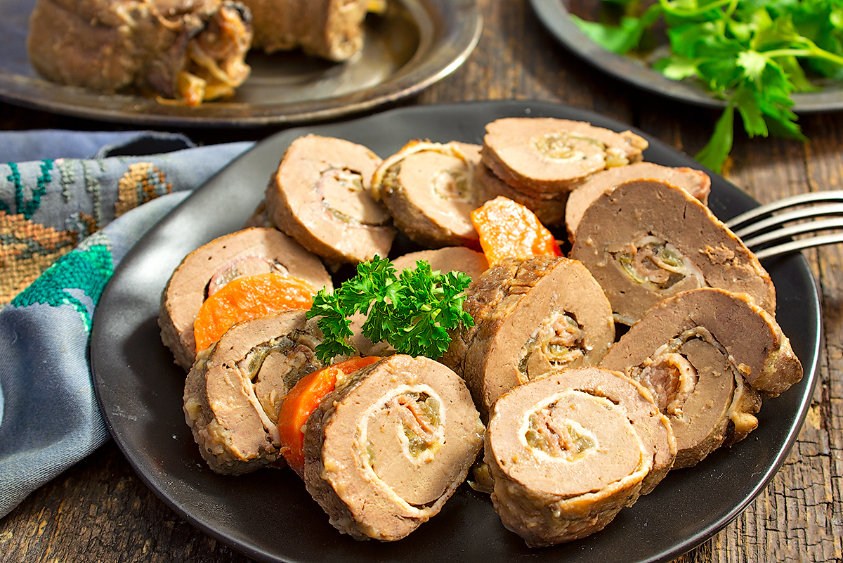 Как только рулет зарумянится, переложить его в кастрюлю и тушить до готовности в небольшом количестве воды с добавлением лука, моркови, петрушки или сельдерея. Готовый рулет положить под легкий пресс для придания формы. Перед подачей нарезать тонкими ломтиками, уложить на блюдо.