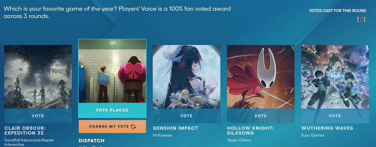 Тем временем Player's Voice добрался до финального этапа. В него попали Clair Obscur: Expedition 33, Dispatch, Genshin Impact, Hollow Knight: Silksong и Wuthering Waves. Мой выбор виден на скрине. Уйму хороших игр отбросили ещё на первом этапе. Уже видя второй пропала всякая надежда на хороший пик. Dispatch и 33 конечно круто, но были и другие хорошие игры в этом году. Хотелось, чтобы хотя бы в «Выборе игроков» они отметились.