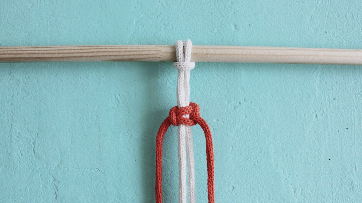 4. Растяните левый и правый шнуры в стороны — так вы завершите первую половину левого квадратного узла.