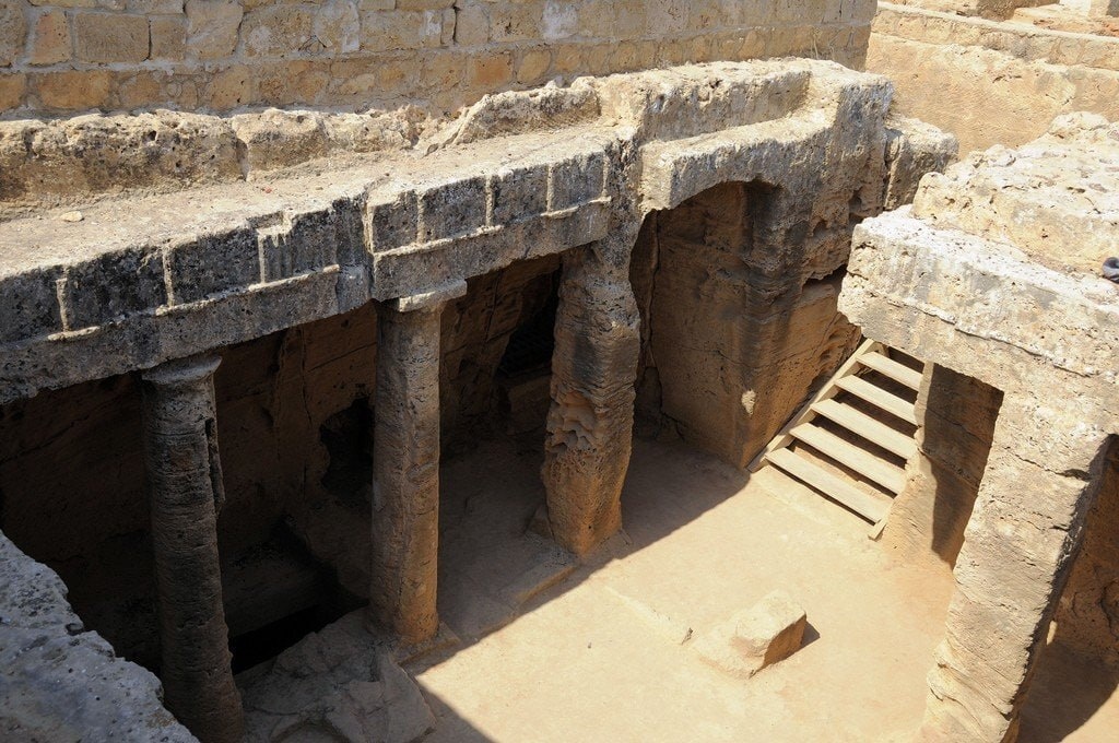 В двух километрах от гавани Пафоса сохранился большой некрополь, известный по всем путеводителям как Царские гробницы. Название своё некрополь получил вовсе не из-за захоронения там царей, а из-за роскошного убранства и общего великолепия погребального комплекса. Хотя здесь и не хоронили царей, большая часть гробниц принадлежит людям знатным: представителям влиятельных династий, аристократам, высоким должностным лицам и т. д. Большая часть захоронений датируется IV–III веками до н. э., а впоследствии Царские гробницы стали местом убежища для первых христиан. Исследования некрополя начались несколько веков назад, но масштабные раскопки провели только в 70–80-х годах прошлого века. До этого гробницам не посчастливилось попасть в поле зрения итальянского археолога Луиджи Пальма ди Чеснолы. Желая снискать славу, но не желая руководствоваться принятыми в археологии принципами, итальянец вывез большую часть найденных артефактов в США, где они находятся по сей день. И всё же главная ценнос