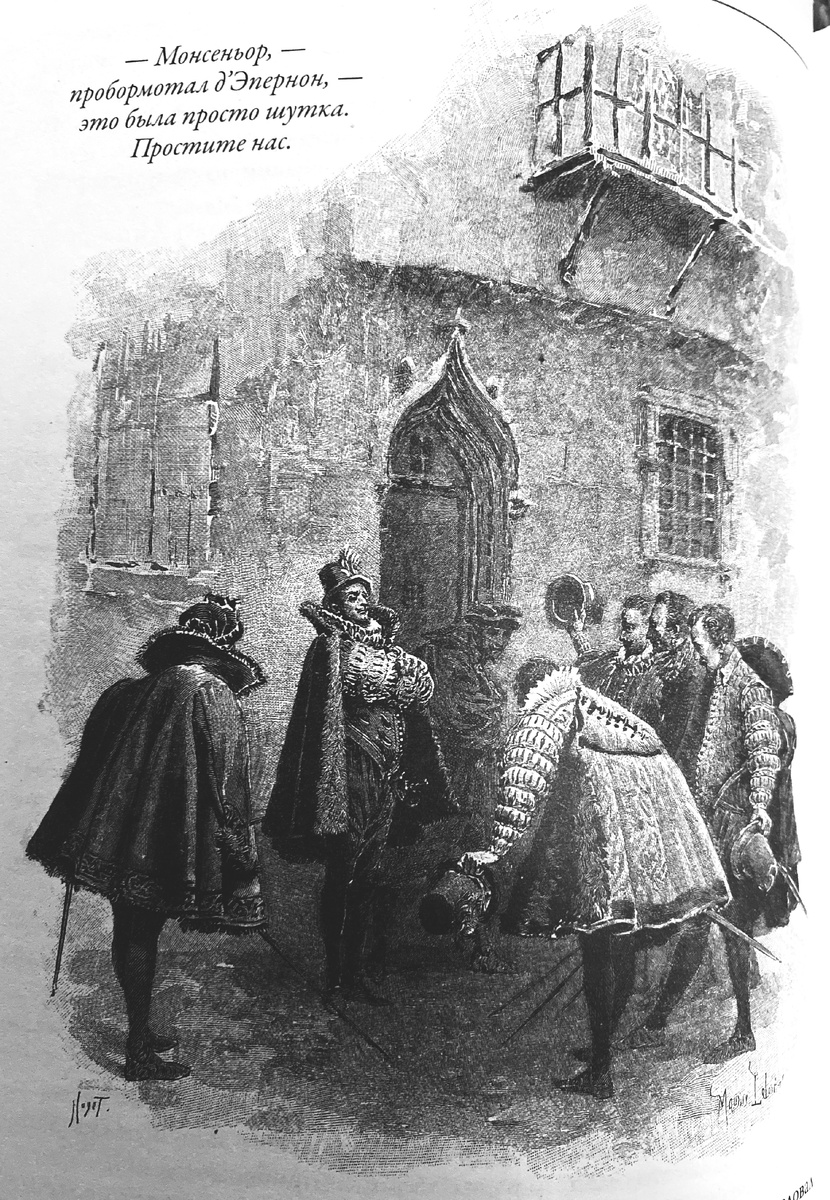 Продолжаю показывать иллюстрации замечательного художника Мориса Лелуара к роману Дюма "Графиня де Монсоро". На этот раз по заявкам читателей сцена нападения миньонов на Бюсси. Правда, в этот раз ничего нового вы не увидите. Это иллюстрация знаменита очень давно, и ее неоднократно воспроизводили в Интернете. И да — одна единственная. Лелуар не стал изображать все подробности боя. Но кое на что я ваше внимание обращу. Но сначала ошибочное нападение миньонов на Франсуа Анжуйского, точнее, последовавшая за этим попытка извиниться перед принцем. Хотя эту иллюстрацию вы уже видели. Франсуа с Орильи ушли, и через некоторое время появляется Бюсси, на которого и совершается нападение. И вот та самая знаменитая иллюстрация: Как выразительно! Какие выпады делают миньоны, особенно тот, что на переднем плане. Бюсси обороняется, а на переднем плане лежит его конь. И вот тут... Вы помните, почему конь оказался на земле? А потому что: Шомберг метнул нож с широким клинком, более тяжелым чем рукоятка