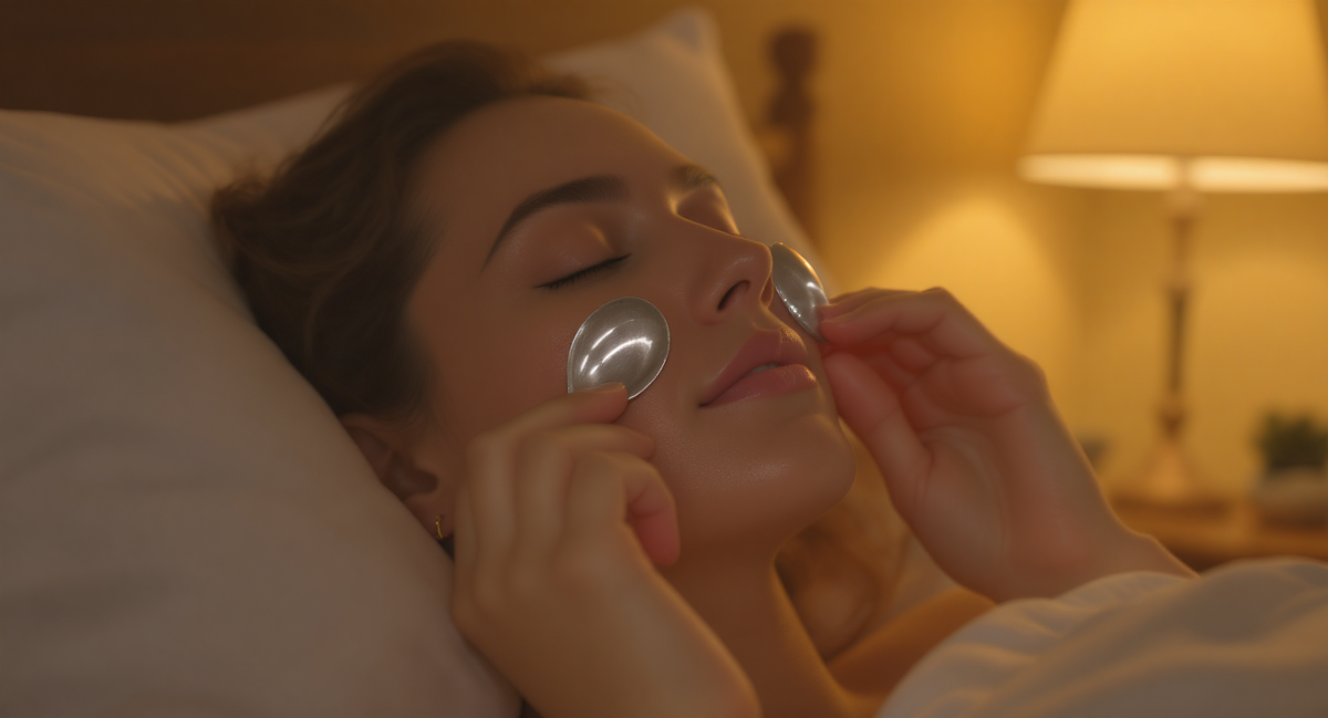 Секрет в том, что отёки — это не всегда про еду и воду. Это про застой. Застой лимфы, который копился весь день, пока ты сидела за компьютером, щурилась на экран и нервничала. Ночь — не враг. Это твой тихий союзник, если дать ему правильные инструкции. Вот твой персональный вечерний протокол. Выполняй пункты за 30-60 минут до сна, и утро будет другим. Шаг 0 (Самое важное): Включи «режим дренажа» изнутри Тело нужно настроить на отток. Сделай две простые вещи за 2 часа до сна: Выпей стакан ТЁПЛОЙ воды с долькой лимона или щепоткой имбиря. Не холодной! Тёплая — как сигнал организму: «Расслабься, всё в порядке, можно выводить лишнее». Холодная — наоборот, стресс и задержка жидкости. Отложи телефон. Синий свет экрана = стресс = кортизол = «зажмись и держи воду». Включи спокойную музыку, аудиокнигу, подкаст. Дай лицу и мозгу отдохнуть от концентрации. Шаг 1: Массаж ложками (Твой личный ледяной ритуал) Тебе понадобятся две обычные металлические ложки. Положи их в стакан и отправь в морозилку,
