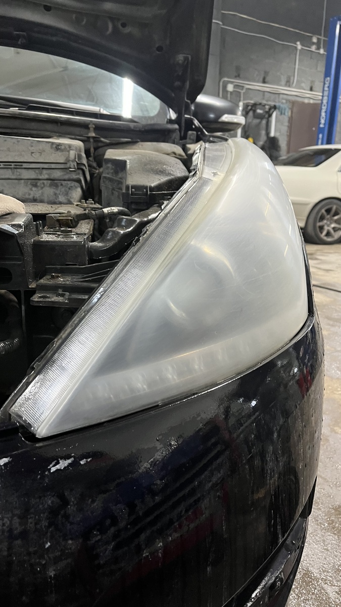 Со временем даже самые качественные фары покрываются матовым налётом, царапинами и становятся молочно-белыми. Свет падает хуже, машина выглядит старее, а обычная полировка пастами помогает ненадолго. Но есть способ, который работает быстрее и чище — бесконтактная химическая полировка, где восстанавливающий состав наносится в виде горячего пара. Я покажу этот метод на примере — ниже мои реальные фото до и после, а процесс я снимал на видео. До восстановления: фара полностью матовая На фото видно, что стекло практически не пропускает свет. Поверхность вся в микротрещинках и выглядит как покрытая инеем: 📌 Что я использовал Чтобы восстановить фары без шлифовки, понадобились: химический восстановитель (капсула для паровой полировки); отпариватель / мини-небулайзер; Если нет — можно использовать чайник как источник пара для нагрева капсулы; малярный скотч; обезжириватель; микрофибра. Метод максимально простой: не нужно шкурить, не нужно полировать машинкой — работаем только паром. Как