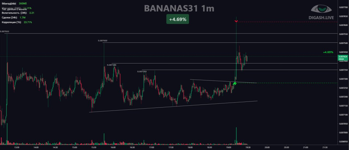 Напомню, что у меня есть Telegram‑канал, в котором я показываю сделки ещё до захода в них, рассказываю о своей жизни и делюсь разными инсайтами. Также периодически составляю портфели облигаций (флоутеры / фиксы / смешанные / ОФЗ / валютные). Telegram: https://t.me/cryptoicruz 1.Скрин графика / монета / вводные данные (если вводных данных нет, значит, сделка не новая, и больше информации вы сможете найти в Telegram‑канале). Объем: 265млн Сделки: 1,7млн Корреляция: 24,91 Вола: 2,21 Изм. цены: 23,71% 2.Повествование: точки входа / тейк‑профиты / стопы. ТВХ - точка входа обусловлена тем, что у нас происходило поджатие к лонговой наклонке и лонговым уровням, тем самым оставалось только найти место, где рынок решит снимать ликвидность. Этой точкой стал пробой лонгового локального уровня (обращаю внимание , уровня , а не наклонки) Стоп был за плотность, на графике ее не увидим, но в будущем буду добавлять скрины из стакана. Тейки как и обычно выставил на пересечение лонговых уровней, удало