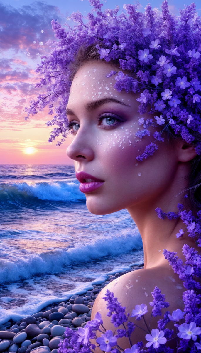 НейроМагия✨: Дива на берегу прозрачных волн под пурпурным закатом