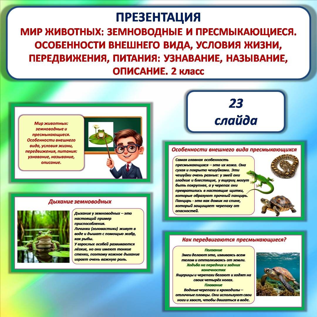 Презентацию скачать здесь Презентация «Мир животных: земноводные и пресмыкающиеся. Особенности внешнего вида, условия жизни, передвижения, питания: узнавание, называние, описание» разработана к уроку окружающего мира во 2 классе. Презентация состоит из 23 слайдов. Слайд № 1. Титульный слайд. Слайд № 2. Кто такие земноводные. Слайд № 3. Как выглядят. Слайд № 4. Кожа земноводных - их важное отличие. Слайд № 5. Дыхание. Слайд № 6. Где живут. Слайд №7. Как передвигаются. Слайд № 8. Что едят. Слайд № 9. Интересные факты о земноводных. Слайд № 10. Кто такие пресмыкающиеся. Слайд № 11. Особенности внешнего вида пресмыкающихся. Слайд № 12. Где живут и как размножаются. Слайд № 13. Как передвигаются пресмыкающиеся. Слайд № 14. Змеи. Слайд № 15. Ящерицы. Слайд № 16. Удивительная ящерица - хамелеон. Слайд № 17. Черепахи. Слайды № 18-19. Крокодилы. Слайд № 20. Интересные факты о пресмыкающихся. Слайды № 21-22. Почему земноводные и пресмыкающиеся важны для природы. Слайд № 23. Что мы можем сделать