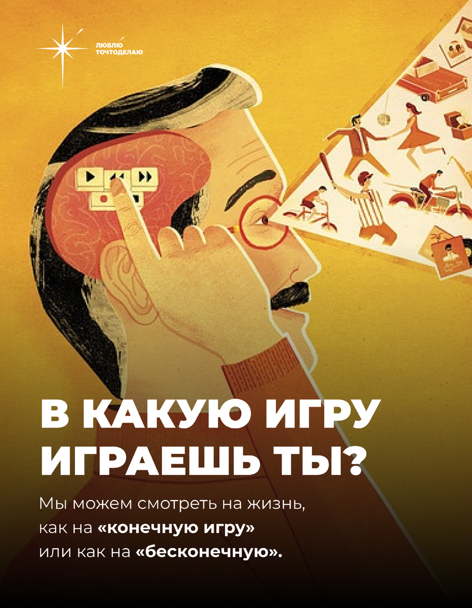 Мы можем смотреть на жизнь, как на «конечную игру» или как на «бесконечную» Когда мы смотрим на жизнь как на «конечную игру», у нас всего две опции: не проиграть и выжить. Например, если мы гонимся за деньгами, то «конечная игра» выглядит как выигрыш, когда мы получаем какую-то сумму денег, а проигрыш — когда этого не происходит. Во всех «конечных играх» человек чувствует себя очень плохо. Его путь похож на изматывающую гонку с короткими передышками. Единственный короткий момент, когда он может насладиться жизнью — это победа. Но так как у «краткосрочного игрока» формируется привычка играть в конечные игры, после победы он снова и снова запрыгивает в гонку. Он достигает, чтобы достигать, пока его игра не закончится. Если ты «конечный игрок», тебе приходится верить, что это всё очень серьёзно. Если же ты «бесконечный игрок», то ты выигрываешь, когда понимаешь, что все это несерьезно. Ты знаешь, что игра никогда не заканчивается, потому что это всего лишь игра. Если в «конечной игре» т