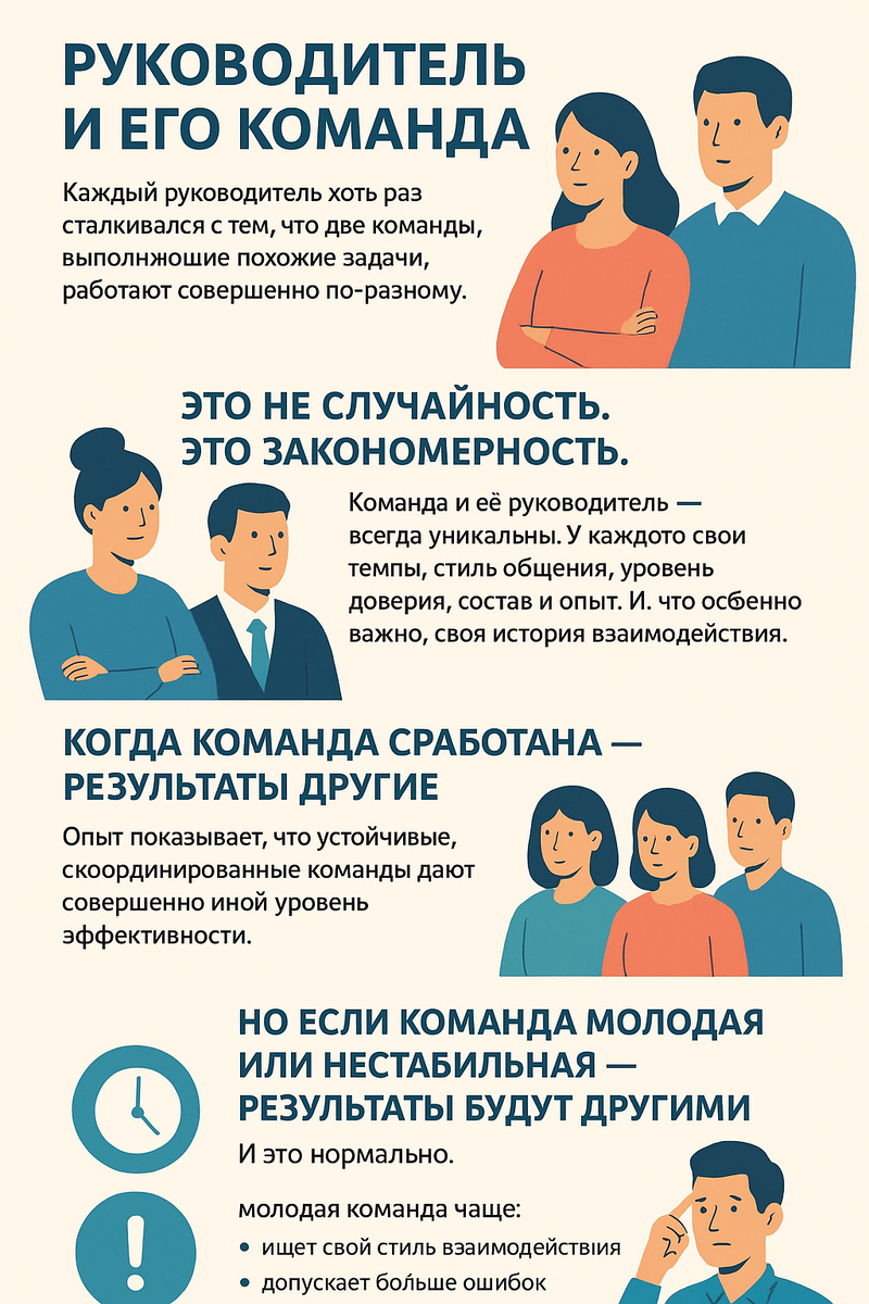 Каждый руководитель хотя бы раз сталкивался с тем, что две команды, выполняющие одинаковые задачи, показывают совершенно разные результаты. И чем дольше работаешь с людьми, тем яснее становится: дело не только в навыках или опыте. Дело в уникальности самой команды — её темпе, уровне доверия, стиле общения, истории взаимодействия и даже в особенностях характера каждого участника. Я уверена в этом не по книгам. Лично я работаю со своими ключевыми сотрудниками уже около восьми лет. За это время мы научились взаимодействовать буквально с полуслова. Мы уже предугадываем реакции друг друга, понимаем, кто какую часть задачи потянет лучше, и умеем распределять нагрузку интуитивно. Такая сработанность всегда приносит результат — стабильный, предсказуемый и сильный. Это как в хорошо сыгранном оркестре: каждый знает свою партию, но слышит и чувствует всю музыку. Но это только одна сторона медали. А если команда молодая, новая, только формируется? Нередко кажется, что это минус: взаимодействие не