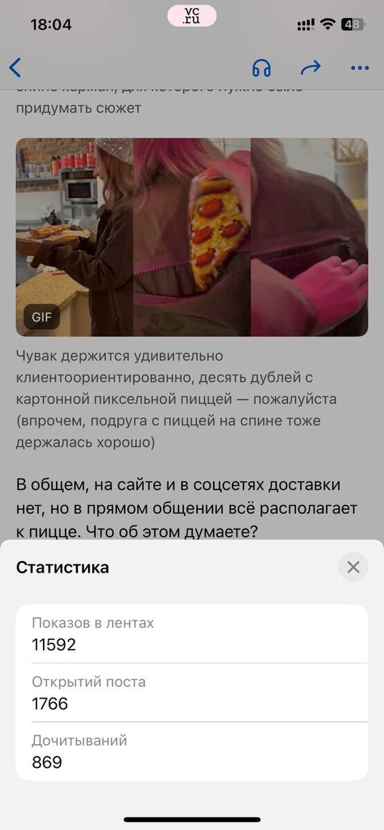 Компенсировать ход времени не нужно, а то тебе как в конце Догвилля скажут — эй, много на себе берешь ) 🥃 Конечно же, я пару дней была опьянена нашей статистикой по статье про Серф. Последнее время на виси просмотры 3К уже в целом приятно, 5-6К — вообще отлично. А тут Auld Lang Syne. Ну, и конечно дочитываемость, почти каждый второй! Общалась с клиентом и заметила, что я уже давно пытаюсь компенсировать то, что алгоритмы и времена изменились. Ну, полтора года назад на виси можно было предсказуемо получать 15К просмотров, а если всё хорошо сложится, вообще 30К. Сейчас всё работает иначе, и если клиент ведет блог на виси, я стала подразумевать бесплатные доп публикации, к примеру, на Хабре или Составе. Статья, конечно, та же, но это Анины часы — верстка и мониторинг. Как комплимент — иногда это нормально. Но как базовый порыв борьбы со временем (борьба со временем без увеличения бюджета) — опасно и тупиково. Представьте, вот я ходила на буккальный массаж, мне там разжимали челюсть, и я
