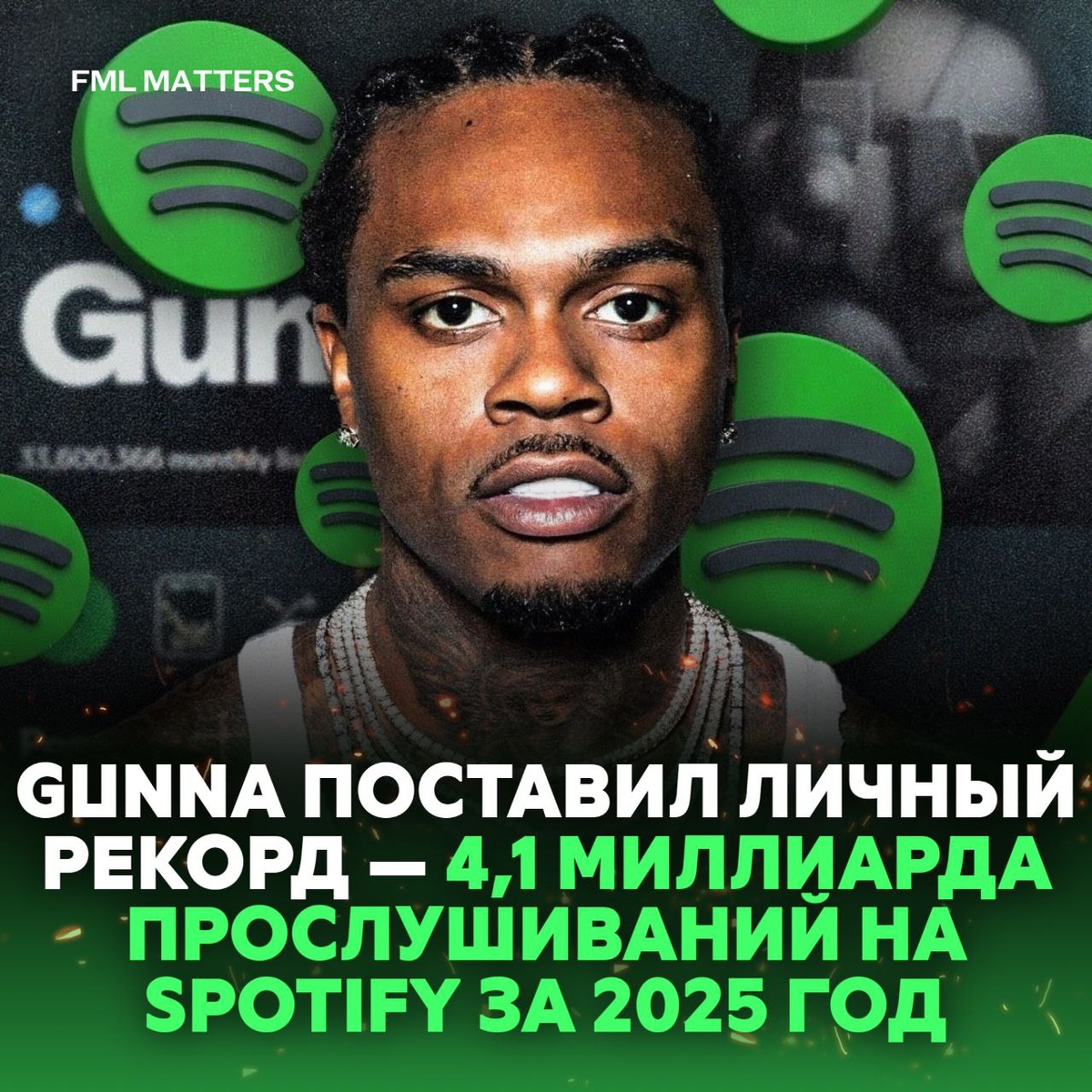 ⚡️ GUNNA ВЫЖАЛ БОЛЕЕ 4 МЛРД ПРОСЛУШИВАНИЙ ЗА ГОД! Рэпер поставил личный рекорд — 4,1 миллиарда прослушиваний на Spotify за 2025 год. Это уже четвёртый год подряд, когда Ганна показывает такие масштабные цифры. Ваш любимый трек Ганны за этот год? 🤔 💀 FML MATTERS