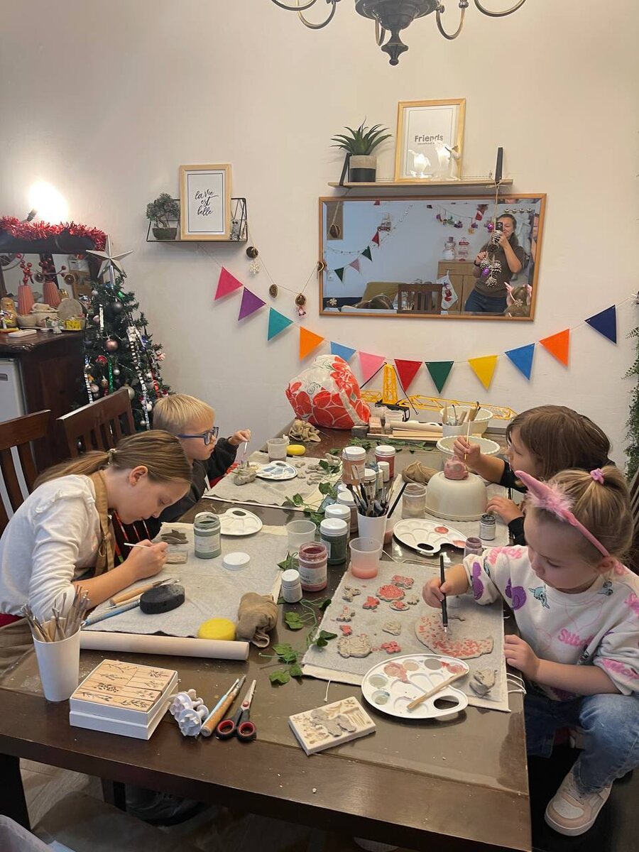 В нашем керамическом клубе полным ходом подготовка к Новому Году Делаем новогодние игрушки, статуэтки, тарелочки и кружки. Одинаково увлечённо занимаются и взрослые, и дети. Особенно ценно, что самые маленькие гости творят наравне со взрослыми: лепят, раскрашивают, придумывают свои формы и воплощают фантазии. Два часа концентрации, моторики и творчества💪🏻 — дети приобретают по-настоящему важный и полезный навык. (Для самых маленьких и не только, мы делаем перерыв на чай и вкусняшку) Но в последнее время я всё реже успеваю фотографировать готовые работы — после обжига стараюсь отдавать изделия сразу, чтобы гости не ждали свои творения.🙏🏻 Но каждая работа остаётся в памяти своей искренностью и теплом. Если у Вас дома есть работа с МК которой вы хотели бы поделится. Фотографируйте и присылайте в комментарии 😉
