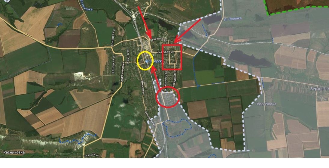 Из Северска продолжают приходить обнадёживающие данные, экстраполировав которые можно предположить, что к Новому году (или сразу после него) в России может стать на один город больше. Для начала взглянем на карту общей обстановки. Напомним, что линия соприкосновения тут довольно консервативна и на деле она несколько иная (мы покажем какая): На карте отмечено продвижение наших с юга города. Собственно говоря, именно отсюда наши зашли и давят посильнее всего. Именно тут наши закрепились в жилой застройке (красный овал) и отсюда уже действуют в направлении остального города активнее всего: На севере сейчас идёт борьба за высотную застройку, продвижение тут не столь интенсивное: О точной обстановке доложить пока не можем, но продвижение у наших есть, хотя сопротивление с той стороны достойное. Да и как всегда, в многоэтажках работа имеет специфический характер и, как правило, она всегда идёт дольше, нежели в частной одноэтажной застройке. По ряду данных прямо сейчас особенно жарко на вы
