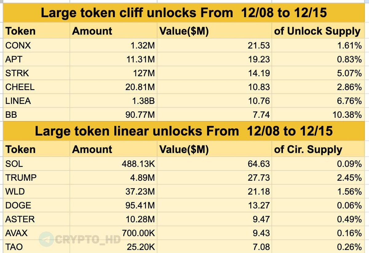 #анлок 🔓 ТОП разблокировок токенов с 8 по 15 декабря! Cliff Unlocks: ▫️#CONX - $21,53m ▫️#APT - $19,23m ▫️#STRK - $14,19m ▫️#CHEEL - $10,83m ▫️#LINEA - $10,76m ▫️#BB - $7,74m Linear Unlocks: ▫️#SOL - $64,63m ▫️#TRUMP - $27,73m ▫️#WLD - $21,18m ▫️#DOGE - $13,27m ▫️#ASTER - $9,47m ▫️#AVAX - $9,43m ▫️#TAO - $7,08m P.S. Cliff Unlocks – разблокировка крупной порции токенов единовременно в конкретную дату. Linear Unlocks – постепенная разблокировка токенов в течение определенного периода (обычно каждый день или каждую неделю по части). Crypto Headlines