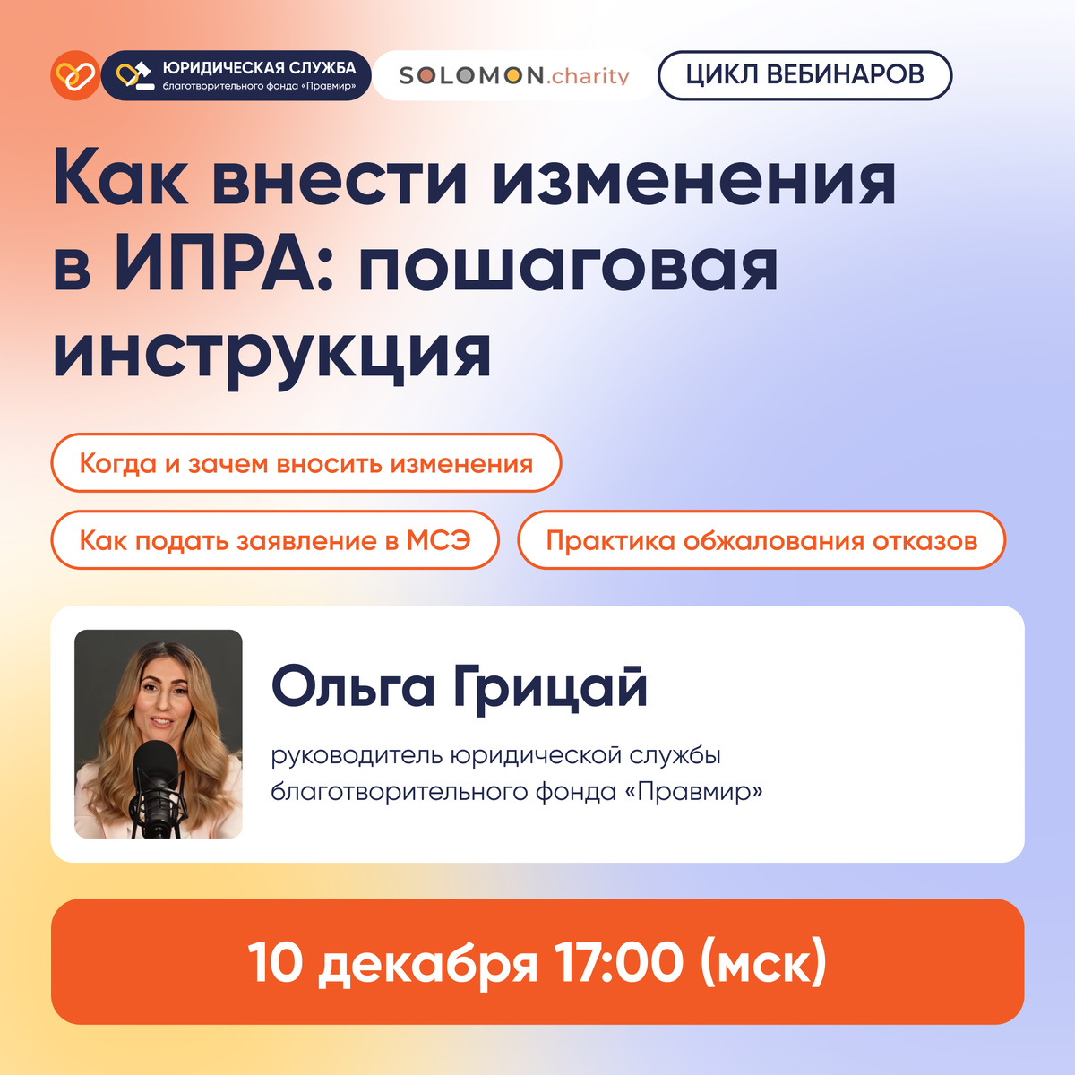 по юридическим вопросам в здравоохранении 10 декабря в 17:00 (мск) Тема: "Как внести изменения в ИПРА: пошаговая инструкция — Когда и зачем вносить изменения — Как подать заявление в МСЭ — Практика обжалования отказов" Обязательная регистрация по ссылке: https://forms.gle/gFEem7jXf4PDNBHr8 ☝🏼 Важно: • Ссылка для подключения к конференции придет вам на почту за час до вебинара. • Запись вебинара придет на почту, указанную при регистрации. ----— ✅ 12 вебинаров по актуальным медицинским правам и возможностям граждан РФ - записи прошедших эфиров смотрите в разделе "VK Видео" ✅ Спикер — профессионал и опытный юрист Грицай Ольга Степановна, руководитель юридической службы благотворительного фонда «Правмир» ✅ Онлайн-встречи проходят каждую среду в 17:00 (не более 20 мин + вопросы) ----— *Проект реализуется при поддержке Фонда президентских грантов