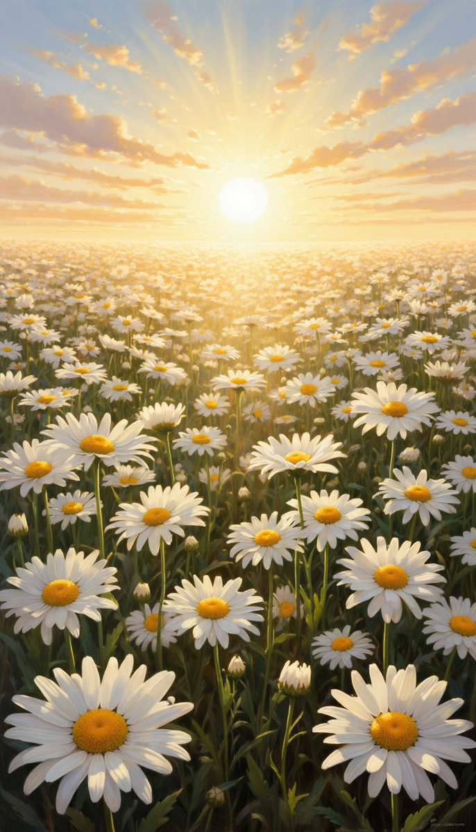 И вот однажды наступило утро, когда люди, проходившие мимо, остановились в изумлении. Весь луг, насколько хватал глаз, был покрыт сияющим бело-золотым ковром. Это цвели Ромашки. Тысячи, миллионы маленьких солнышек, собранных в одно великое, дышащее полотно. Их скромная красота, умноженная на упорство и трудолюбие, превратилась в мощь и великолепие. Казалось, что само солнце, садясь вечером, опускается в это море цветов, чтобы отдохнуть в их нежном сиянии, а утром поднимается прямо из его глубины.