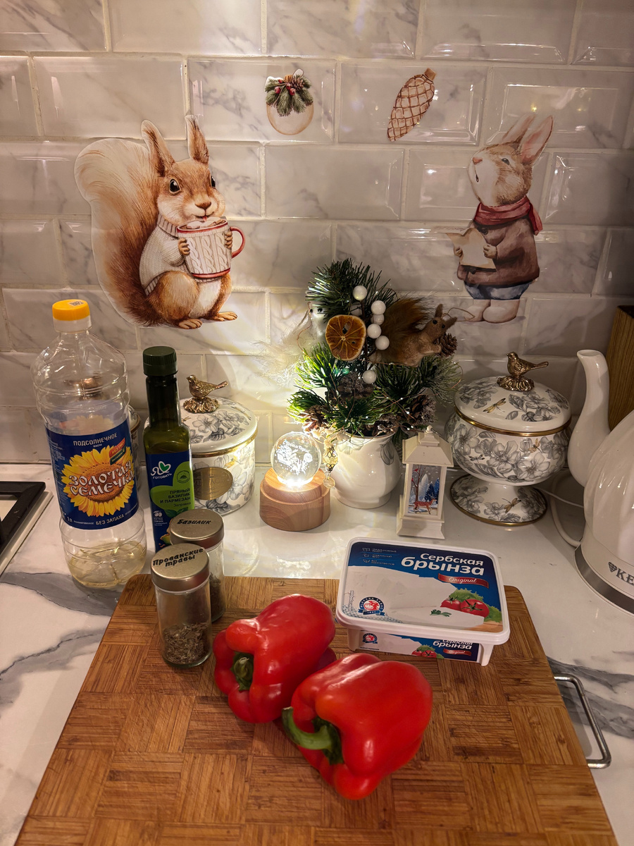 Приветствую всех на своем канале. Хочу предложить вам очень простую в приготовлении закуску, которую можно подать на новогодний стол или на посиделки с друзьями. У меня эта закуска всегда разлетается на ура, готовить ее одно удовольствие, но еще большее удовольствие смотреть как она исчезает со стола. Если вы любители перцев, то этот рецепт точно для вас. Итак для закуски нам понадобится: перец болгарский; сыр брынза; сушеный базилик; прованские травы; масло (можно растительное, можно оливковое); адыгейская соль. Пропорции не пишу так как они зависят от количества порций и размера перца - в тот что крупнее сыра естественно надо больше. Но по фото будет видно процесс и вы можете скорректировать данное блюдо под себя. Также если вы не любитель брынзы или соленых резких по вкусу сыров, то их можно заменить на моцарелу в шариках. С ней перцы получатся нежнее. Давайте готовить. Перец моем и режем вдоль пополам. Выкладываем половинки перца в форму для запекания. Поливаем перцы маслом (в н