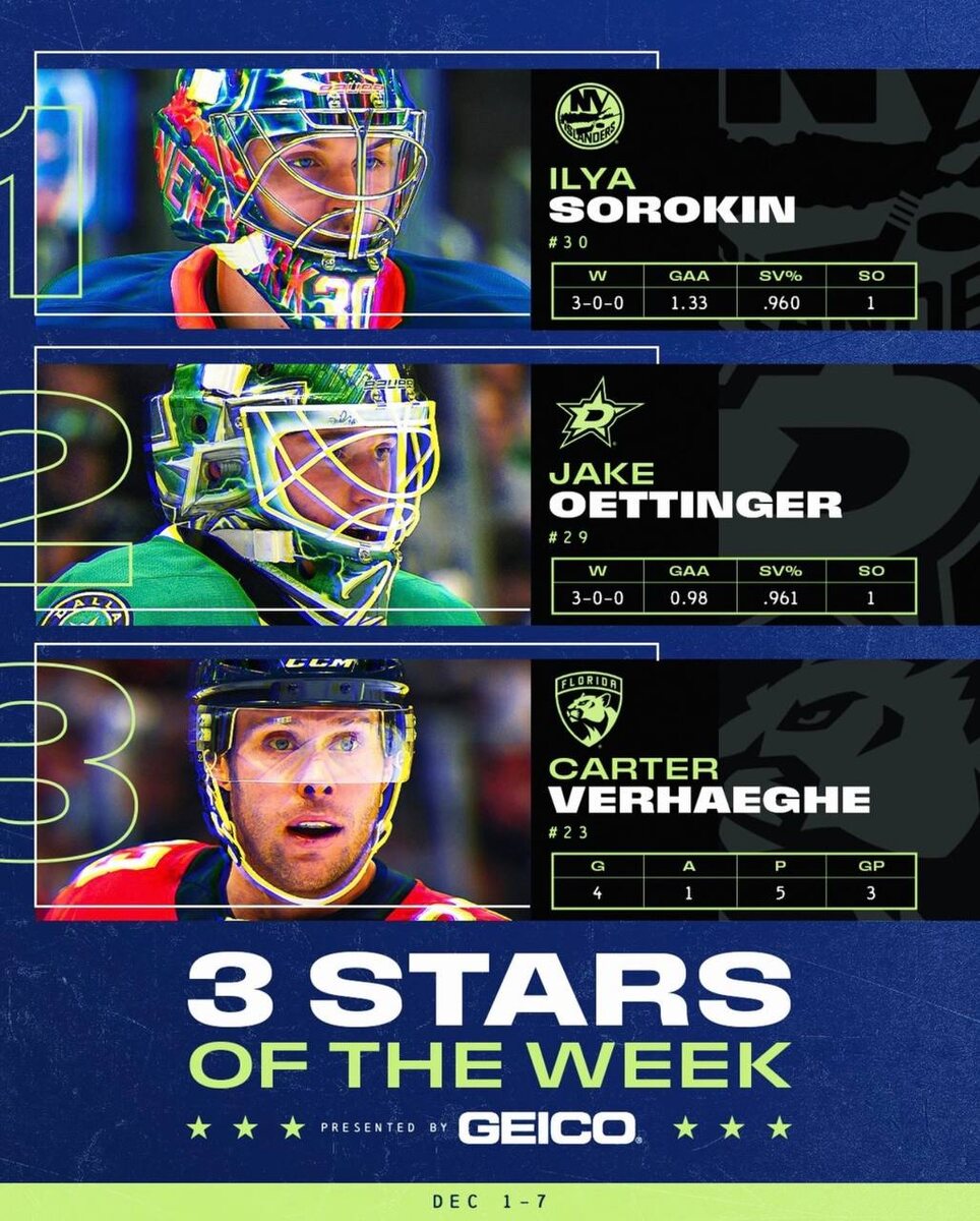 🌟 Илья Сорокин признан лучшим игроком недели в НХЛ 🏒 Российский вратарь «Нью-Йорк Айлендерс» на прошедшей неделе провёл три встречи, во всех его команда одержала победу. Он не пропустил ни одной шайбы в матче с «Тампа-Бэй Лайтнинг» (2:0). В трёх играх голкипер отразил 96% бросков по своим воротам. Второй звездой недели стал вратарь «Даллас Старз» Джейк Оттинджер. Третьей звездой признан форвард «Флорида Пантерз» Картер Вераге. @russian_rt_sport