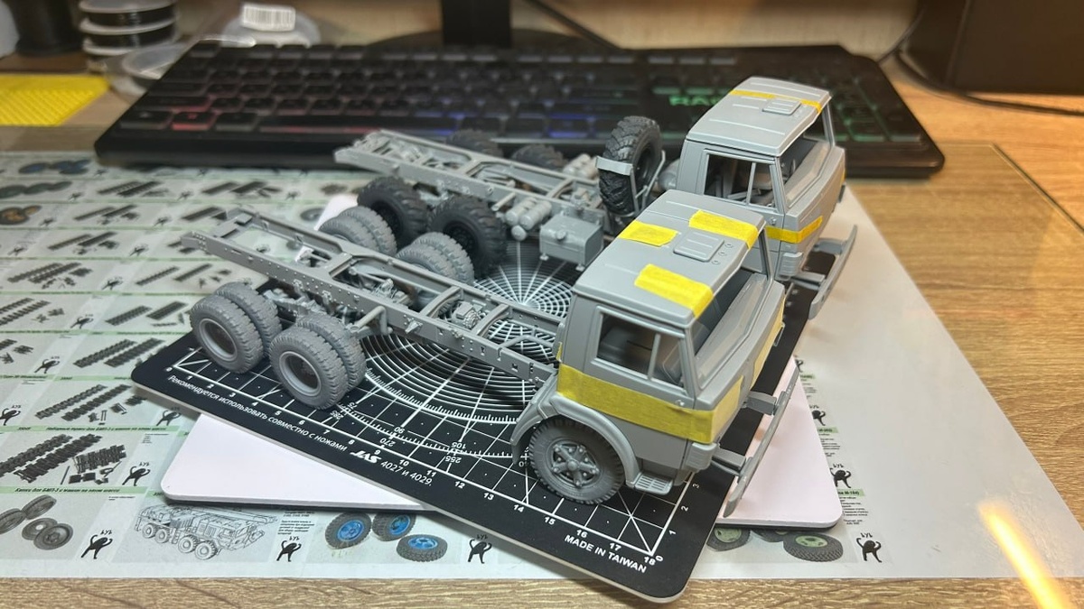 ЪУЪ стоят перед дилеммой относительно моделей тягача КАМАЗ-65225 в 1/35 масштабе: Планировался к выпуску набор на тягач 65225, но есть НО - цена донора (звездовский панцирь), прислонив детали рамы к раме 65115 и совместив их с чертежами увидел, что его длина не меняется. В связи с этим возник вопрос - делать набор, который ограничен количеством деталей из крыльев, сцепного устройства, бака и мелких надстроек в виде лебедки, чтобы потом брать панцирь, срезать с его рамы 1/4, подвергнув ее хирургическим манипуляциям, взять кабину, а остальное пустить в мусорное путешествие? Или же вписаться в смоляную сборку самостоятельного набора? Ну и собственно вопрос по 4310-5320. Балка, бак, крепление запаски. Это наверное будет итоговая комплектация набора. Есть еще идеи по расширению кабины, чтобы был спальник, но это все уже из разряда «вилами по воде»