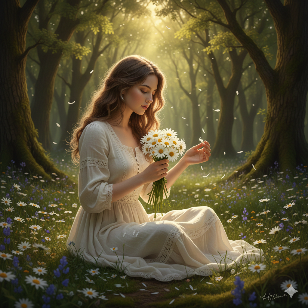 Раз лепесток, два лепесток, три... машинально обрывала она ромашку, почему-то напрочь позабыв, что при этом надо говорить:-"любит, не любит, любит, не любит-..."