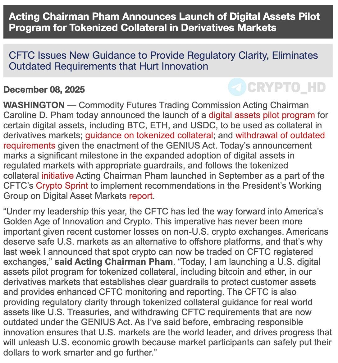 🔥🇺🇸 CFTC разрешает использовать #BTC, #ETH и #USDC в качестве залога при торговле деривативами. ➤ Регулятор объявил о запуске пилотной программы, разрешающей использовать цифровые активы как залог при торговле деривативами. ➤ В первые три месяца разрешены только BTC, ETH и USDC. ➤ Вводятся правила для токенизированного залога. От прежнего подхода, где в залог принимали почти исключительно классические ценные бумаги и наличные, фактически отходят. ➤ Брокеры фьючерсного рынка обязаны вести отдельный учет цифрового залога и каждую неделю подавать отчет в CFTC. ➤ Допускается хранение и передача залога прямо на блокчейне, без традиционных депозитариев. Crypto Headlines