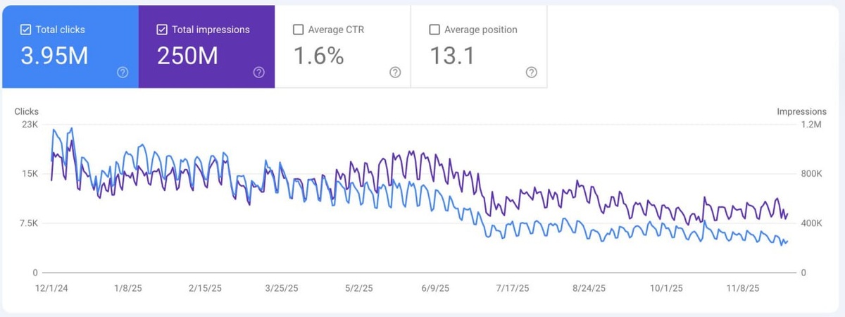 Если ваш органический трафик выглядит сейчас примерно вот так, не стоит паниковать. В этом году Google уничтожил большую часть кликов. Многие практикующие SEO-специалисты отмечают, что никогда не видели столь драматичных изменений, как в 2025-м. И это коснулось практически всех — даже компаний с командами мирового уровня. Правила игры изменились очень быстро. Люди больше не ищут информацию так, как раньше. И Google — не единственное место, где они её ищут. Да и сам Google уже не тот, что раньше: 🔹 От ссылок к ответам: поиск сам теперь отвечает на запросы напрямую, отодвигая органические результаты вниз. 🔹 Доминирование UGC: Reddit, форумы, сообщества, посты в социальных сетях опережают в органике классические блоги. 🔹 Волатильность SERP: ИИ-карточки, эксперименты, постоянные перестановки. Так что, если вы всё ещё измеряете успех трафиком, то используете метрику 2019 года в условиях 2025 года. И нет — вы не «вернёте этот трафик». Вам это и не нужно. Трафик не оплачивает ваши счет