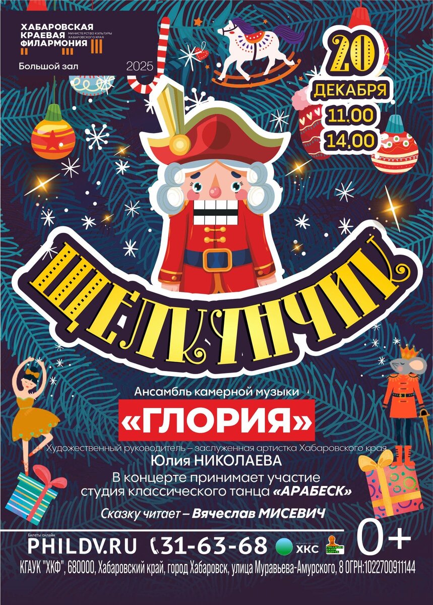 Концерт-спектакль «Щелкунчик» ✔ Музыкальное исполнение ансамбля камерной музыки «Глория» ✔ Участие студии классического танца «Арабеск» ✔ Инсценировка сказки Гофмана в сопровождении музыки Чайковского ✔ Формат — концерт с элементами художественного слова ✔ Продолжительность — 50 минут 📅 Когда: #20_декабря, 11:00, 14:00 ⛳ Где: Хабаровская филармония, Большой зал 💳 Стоимость: 400–600 ₽ Билеты 👉 Афиша Хабаровска. Куда сходить, экскурсии