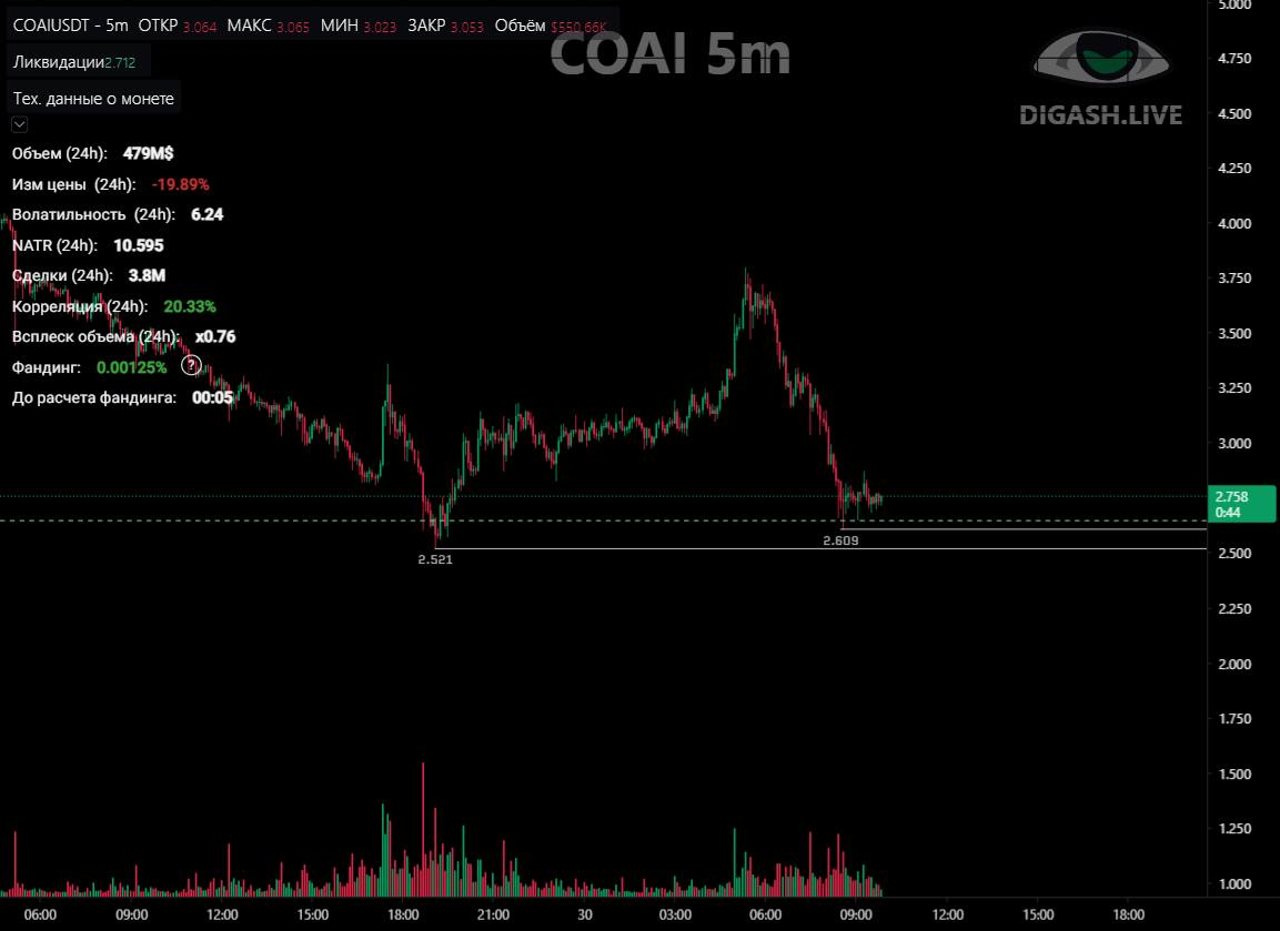 Напомню, что у меня есть Telegram‑канал, в котором я показываю сделки ещё до захода в них, рассказываю о своей жизни и делюсь разными инсайтами. Также периодически составляю портфели облигаций (флоутеры / фиксы / смешанные / ОФЗ / валютные). Telegram: https://t.me/cryptoicruz 1.Скрин графика / монета / вводные данные (если вводных данных нет, значит, сделка не новая, и больше информации вы сможете найти в Telegram‑канале). На этом первом скрине мы можем наблюдать, как развивались события и как изначально выглядела ситуация по инструменту. Монета: COAIUSDT Объём: 479 млн Количество сделок: 3,8 млн Корреляция: 20,33 % Волатильность: 6,24 Изменение цены за день: −19,89 % 2.Повествование: точки входа / тейк‑профиты / стопы. ТВХ — на графике у нас сформировались два шортовых уровня. Хорошо видно, что лонгисты активно защищают одну и ту же область. Поскольку наша задача — снять ликвидность, логично заходить именно на выбивание их стопов, а не пытаться присоединяться к защите уровня. Пе
