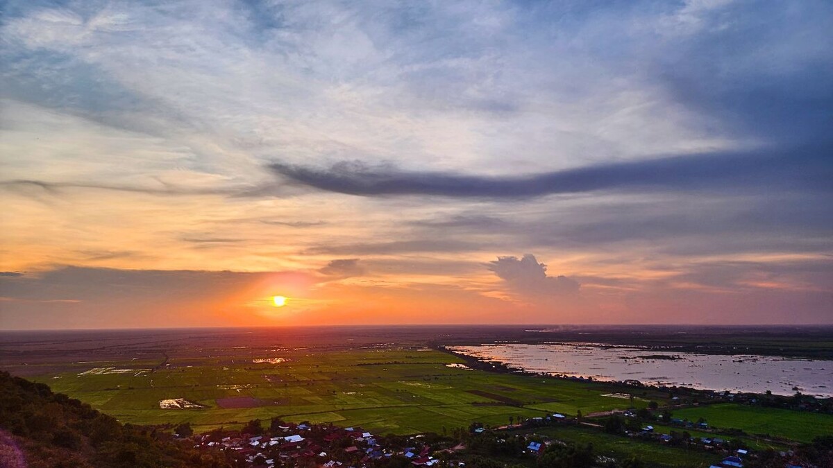 - Театр одного зрителя. Пном Кром возвышается над плоским ландшафтом на 140 метров. Это создает эффект амфитеатра: ничто не перекрывает горизонт на 360 градусов.