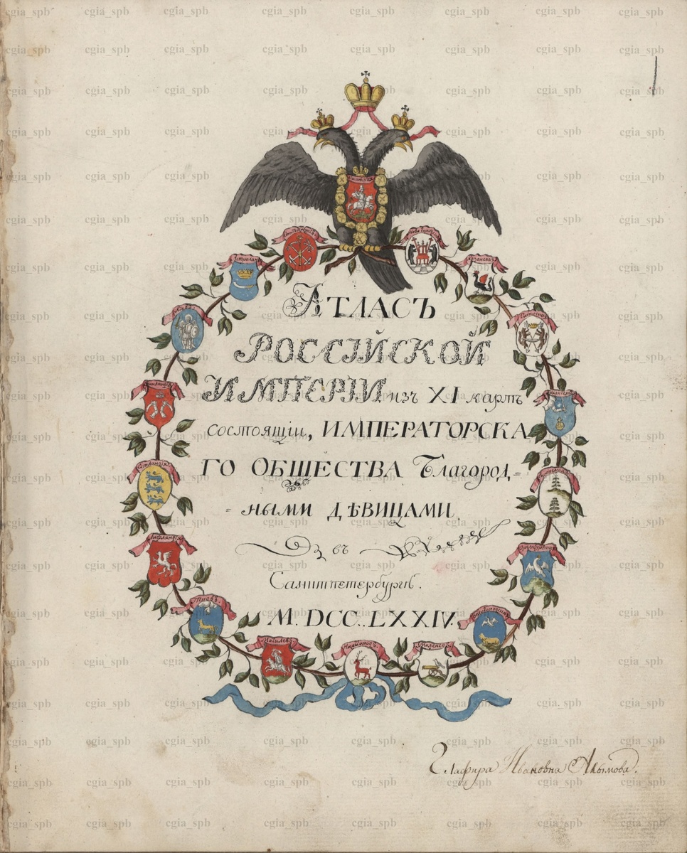В императорской России даже юные девицы с геральдикой дружили 🔥 В Центральном государственном исторической архиве Санкт-Петербурга хранится "Атлас Российской Империи, из XI карт состоящий". На титульном листе которого изображен прекрасный рисунок государственного герба с гербами земель российских. Этот атлас был создан воспитанницами Императорского воспитательного общества благородных девиц (в дальнейшем: Смольный институт благородных девиц) - первого в России женского учебного заведения. Любопытно, что герб Архангельска здесь изображён в виде выходящей из облака серебряной руки с мечом, под которой изображена золотая держава. Примерно так описывал герб Архангельской губернии Чеботарев (но поле должно быть красным). На атласе указан год его создания - 1774 г. А также под чьим руководством он создавался - девица Глафира Ивановна Алымова. Глафира Алымова родилась в селе Голяжье Брянского уезда в 1758 г. С 6-ти лет воспитанница Императорского общества благородных девиц. Входила