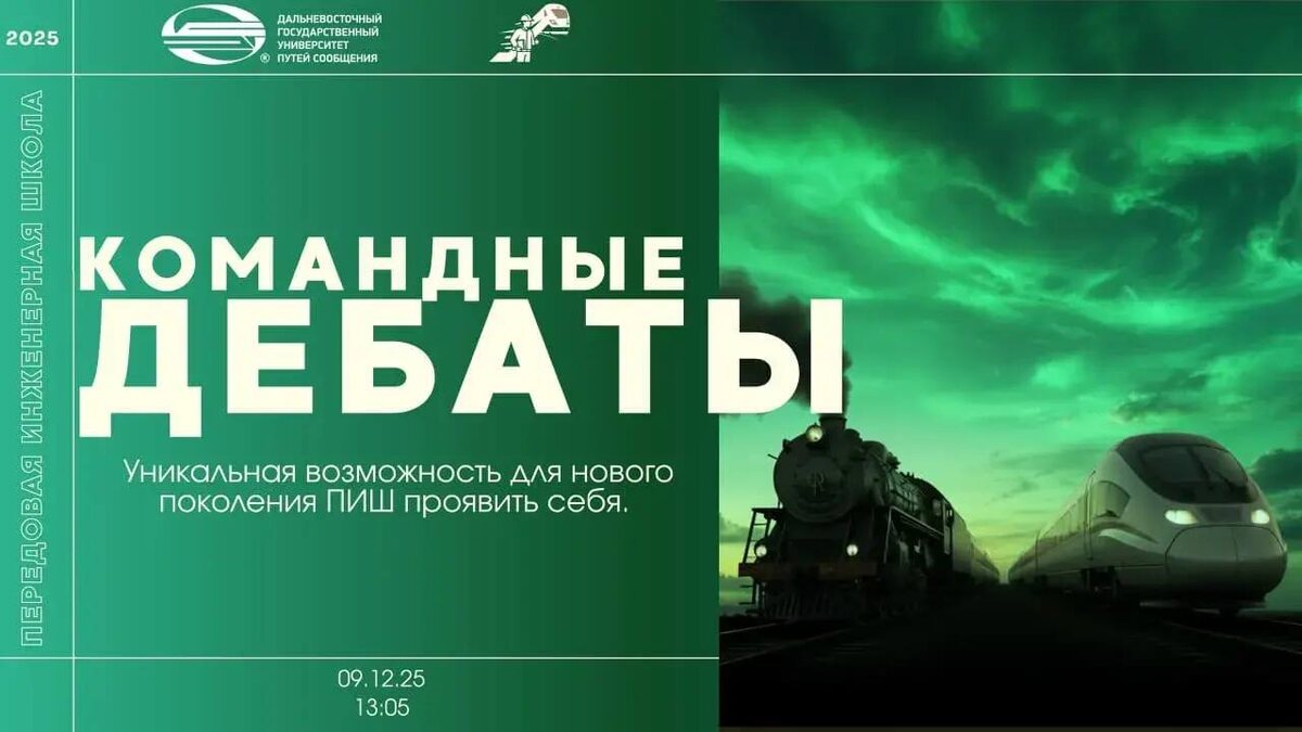 💬 Дебаты для лидеров будущего! Внимание, студенты 2 курса! Передовая инженерная школа Г.М. Фадеева открывает двери для нового поколения и приглашает вас на интеллектуальные «Дебаты»! Это твой шанс стать частью сообщества «Лидеры будущего» и заявить о себе! Ждут именно тебя, если ты учишься на: ✔️ Эксплуатации железных дорог ✔️ Строительстве железных дорог ✔️ Системах обеспечения движения поездов ✔️ Информационной безопасности автоматизированных систем ✔️ Нефтегазовом деле ✔️ Пожарной безопасности 🗓 9 декабря ⏲ 13:05 (4-я пара) 📍 Ауд. 314 Это отличная возможность: 🔵весело провести время; 🔵прокачать навык работы в команде; 🔵вовлечься в деятельность ПИШ; 🔵познакомиться со старшими представителями ПИШ; 🔵проявить себя и показать свои сильные стороны. 🚂 Это больше, чем просто дебаты. Это твой первый шаг к сообществу самых амбициозных и перспективных инженеров. ДВГУПС В МАХ 👻