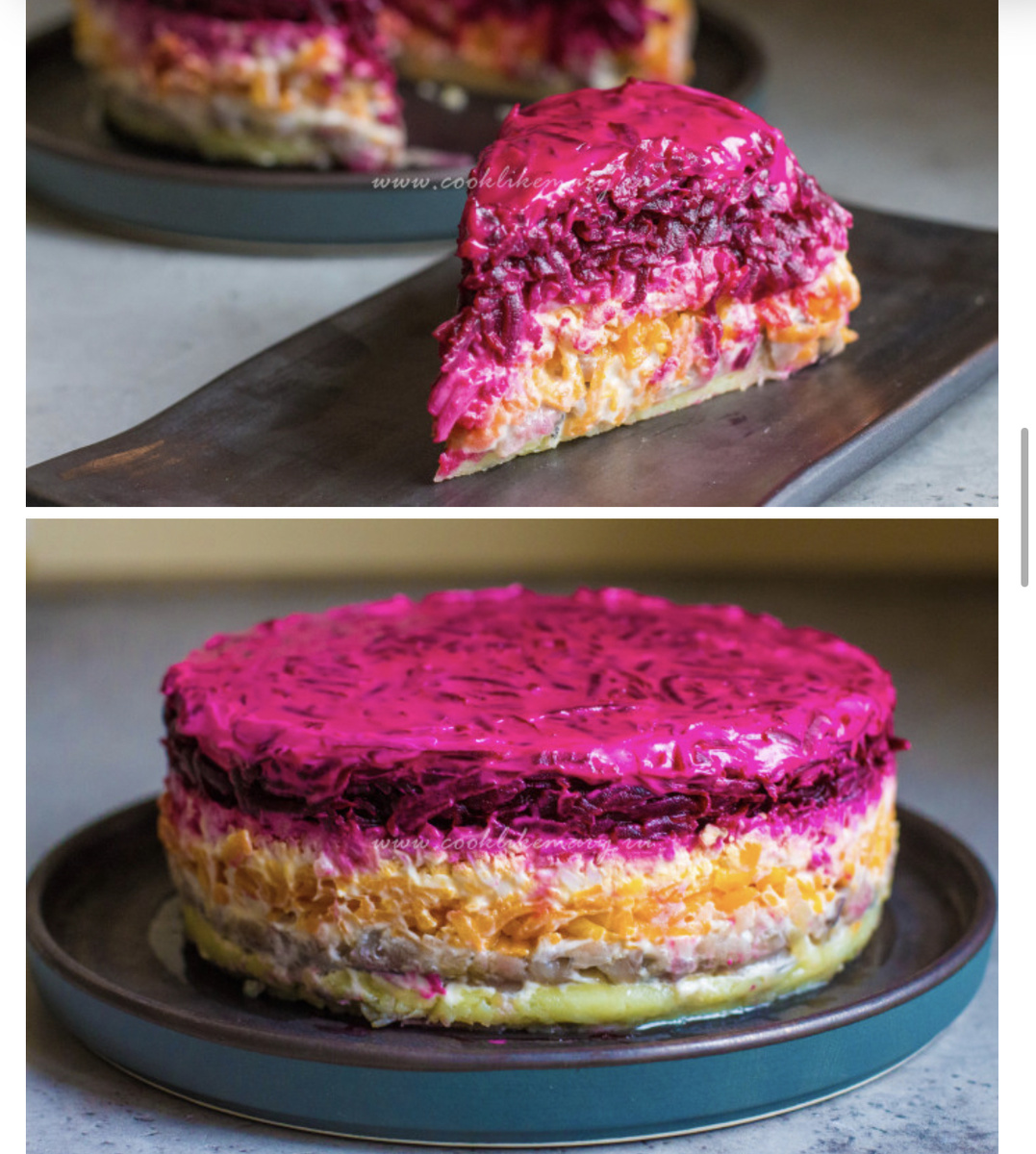 Ингредиенты: - Филе соленой селедки — 250 г - Картофель — 3 шт. - Морковь — 2 шт. - Свекла — 2 шт. - Лук репчатый — 1 шт. - Майонез — по вкусу - Соль — по вкусу - Перец — по вкусу Приготовление: 1. Подготовьте овощи: Вымойте и отварите картофель, морковь и свеклу до готовности. Остудите и очистите. 2. Нарежьте: Филе селедки нарежьте небольшими кубиками. Лук мелко нарежьте. 3. Натереть овощи: На терке натрите картофель, морковь и свеклу отдельно. 4. Соберите салат: - На дно блюда выложите слой картофеля, посолите и поперчите, намажьте майонезом. - Далее выложите слой селедки, затем лук, снова майонез. - Следующий слой — натертая морковь, майонез. - Завершите свеклой и обильно намажьте майонезом. 5. Уберите в холодильник: Дайте салату настояться несколько часов, лучше на ночь. Приятного аппетита!