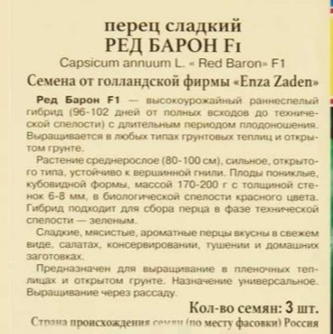 С тех пор, как я увлеклась выращиванием перцев я нахожусь в поиске сорта или гибрида кубовидных перцев, который будет и урожайный и раннеспелый. Ну согласитесь не интересно выращивать с февраля-марта растение, ухаживать, тратить время, силы и деньги ради результата в 3-4 перца, которые будут чуть лучше чем в магазине. Тут уж и правда проще купить. Каждый год пробую новые и пока результаты были так себе. Но вот гибрид «Ред барон» подал серьёзную заявку на право быть в моей теплице. Вот что пишет продавец семян на упаковке: А теперь покажу, что у меня получилось. Перец был посеян 3 марта. В теплицу высадила в начале мая (юго-восток подмосковья). Ни в рассаде, ни после высадки никаких проблем с ним не было. Как видно на фото - растение сильное, крепкое и здоровое. Листики бледноваты из-за отсутствия солнца на рассадных стеллажах. Его и правда можно назвать ранним - 3 июня на нём уже было несколько завязей одновременно. Через 20 дней это были уже вполне приличные перчики. На упако