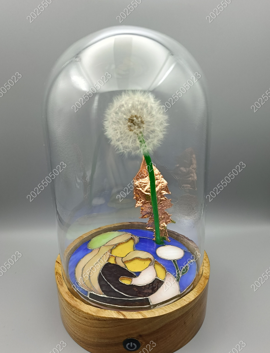 Так родилась мысль заключить настоящий одуванчик под стеклянный купол и соединить его с витражом. Чтобы живой символ стал частью художественного изделия.