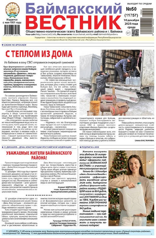 Читайте в завтрашнем номере "БВ" ► Баймакский район завоевал серебро в республиканском зачёте «Вода России» и бронзу за протяжённость очищенных территорий. Сотни волонтёров доказали: гражданская активность меняет экологию региона ► В Москве завершился форум, объединивший педагогов России и соседних республик. Баймак представила Дилюза Каипова – среди 20 участников от Башкортостана она обсудила единые подходы к воспитательной работе ► На региональной конференции «Движения Первых» отметили Баймакский район – он вошёл в топ-10 по итогам года. Иркагуль Алсынбаева поделилась, как за два года команда из трёх специалистов достигла таких высот ► Там, где закрылись школы и опустели фермы, Мустафины подняли дом, хозяйство и детей — пример тихого, упрямого сопротивления деревенскому вымиранию ► Башкирское гостеприимство, горы, лошади и девушки в боксёрских перчатках: что поразило чемпионку мира Юлию Немцову в Баймаке