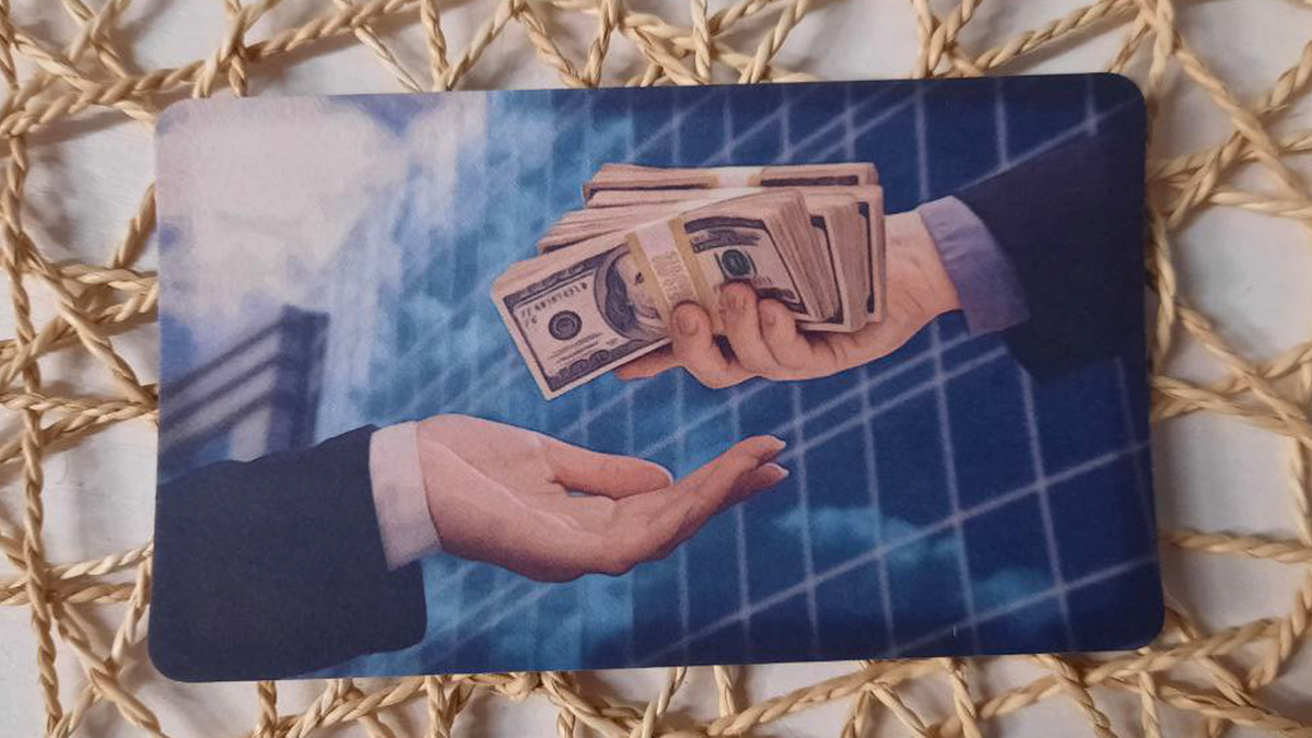 Перед вами символичный образ финансового взаимодействия, доверия и обмена. Рука, передающая деньги, и рука, принимающая их, могут принадлежать как разным людям, так и олицетворять внутренний диалог человека с самим собой. Фон с современным зданием и облаками отражает сферу бизнеса, высоких устремлений и изменчивой, «воздушной» природы финансовых потоков. Четыре пачки купюр символизируют ощутимый, значительный, но структурированный капитал. Что эта карта значит для вас сегодня? Эта карта указывает на денежный поток, который сегодня активизируется в вашей жизни. Это может быть конкретная финансовая операция: получение дохода, оплата, передача средств, инвестирование. На более глубоком уровне карта говорит о доверии — готовности ли вы принять ресурсы от мира или другого человека, либо передать их, будучи уверенным в справедливости обмена. Облака в отражении напоминают, что материальные вопросы сегодня тесно связаны с вашими идеями, планами и умением видеть «отражение» возможностей в дело