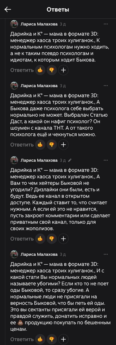 Всем доброго дня! Хочу поделиться одной забавной историей, которая в очередной раз доказала: в интернете порой происходят настоящие спектакли. Недавно я наткнулась на блог мамы 13 детей (и все свои, не приёмные!). Честно, я всегда восхищаюсь такими людьми — представьте, какая самоорганизация и сила духа нужны, чтобы ежедневно организовывать быт такой большой семьи, уделить внимание каждому, обо всех позаботиться и при этом сохранять оптимизм. Но, заглянув в комментарии, я ужаснулась — там творился настоящий хейт-фестиваль! Люди, явно скучающие от безделья, строчили гадости, осуждали, критиковали каждый её шаг. Ну, я не выдержала и решила поддержать блогершу, написав, что некоторые просто сбиваются в стаи, чтобы травить тех, кто живёт не так, как им удобно. И тут начинается самое интересное! Ко мне на канал прибежала одна из активисток этой «группы ненависти» и начала вываливать подробности о «неправильной» маме. Я, конечно, не удержалась — вступила в диалог, стало любопытно, до ч