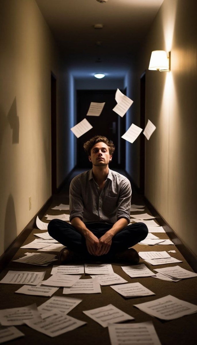 «Ноты на полу» За несколько минут до выхода.Пианист сидит на полу в коридоре, растрёпанные страницы партитуры разложены вокруг. Его взгляд — не здесь, он уже слушает внутреннюю музыку. Беспорядок как отражение творческого хаоса. Решение? 1. Ракурс: Сверху, с небольшой высоты (24mm) 2. Настройки: f/3.2 | 1/80s | ISO 1600 3. Свет: Тёплый свет от бра в коридоре 4. Обработка: Виньетирование, акцент на тексте нот, тёплый оттенок #МитяйРаспиздяй (помогал собирать ноты и перепутал все страницы)#ДмитрийФотокор #Пианист #Партитура #Подготовка 📄