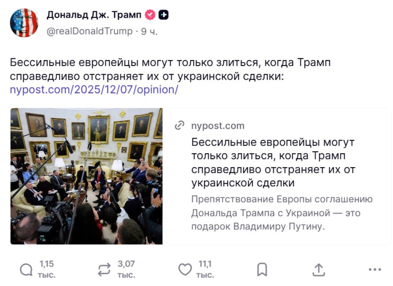 Трамп прекрасно понимает, что Европа саботирует его «мирный план» по Украине и поэтому тоже «плюнул» в Европу, заявив в Белом доме, что «мы хотим, чтобы Европа оставалась Европой. Европа движется в неправильном направлении. Это очень плохо...» В своей соцсети ретвитнул статью из The New York Post, в которой написано: У неудачи много отцов, а успех — сирота. Это противоречит общепринятому порядку вещей, но когда дело касается войны в Украине, европейцы меняют привычный ход государственных дел. Если так будет продолжаться, это может привести к жестокой победе России. Фирма «Witkoff, Rubio & Kushner» предложила мирный план из 28 пунктов, который мог бы обеспечить интересы Америки, стабилизировать отношения с Россией и установить новый баланс сил. Этот план выгоден европейцам по трём причинам, но они ведут себя как жалкие неудачники. Согласно соглашению, Украина сохраняет свой суверенитет и может вступить в Европейский союз. Россия сохраняет контроль над восточными областями Украин