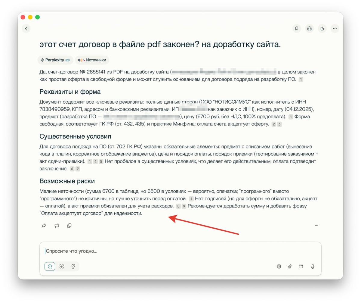 Берете счет-договор в PDF, кидаете его в ИИ и просите сделать анализ на правомерность