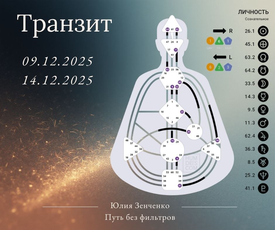 🌞 Солнце в 26-х воротах — Ворота манипулирования 📅 Дата входа: 09.12.2025 ✨ Тень — Гордость В эти дни может подниматься желание доказать, показать, впечатлить. Слово становится инструментом — но не всегда чистым. Можно незаметно начать «приукрашивать» историю, защищая своё эго или старые заслуги. Это энергия, где правдивость проходит испытание. ✨ Дар — Хитрость Когда ты в даре, эта энергия становится искусством убеждения. Ты знаешь, как сказать, чтобы посеять зерно, вдохновить, зажечь других. Это маркетинг по сердцу: умение показать ценность, не теряя искренности. ✨ Сиддхи — Невидимость Высшее проявление этих ворот — умение действовать без следа, без нужды быть замеченным. Здесь человек становится прозрачным каналом — через него звучит Истина, не требующая рекламы. 🌍 Коллективный фон этих дней Поле подталкивает к демонстрации, к «яркому рассказу о себе». Но чем тише эго, тем сильнее воздействие. Сейчас особенно важно различать, где вдохновляешь, а где — манипулируешь. ❓ Вопросы