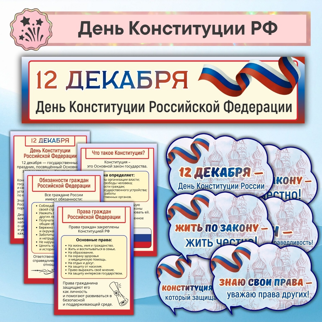 Набор для оформления кабинета к одному из важнейших государственных праздников России — Дню Конституции Российской Федерации, который ежегодно отмечается 12 декабря. В комплект входят: Баннер – 3 листа А4.