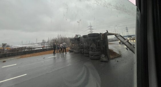 На КАДе образовалась трёхкилометровая пробка из-за перевёрнутого грузовика