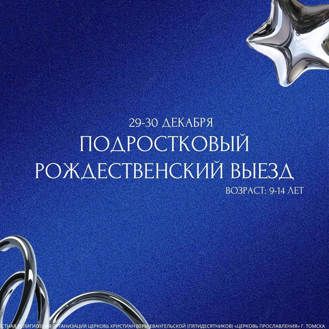 🎄 Подростковый Рождественский выезд 🎄 Уважаемые родители! Приглашаем ваших детей в возрасте от 9 до 14 лет на Рождественский выезд! Когда: 29–30 декабря Где: п. Штамово, ул. Больничная, 37б Рождественский выезд - всегда особенное время, когда мы празднуем день рождения Иисуса Христа в очень душевной, домашней обстановке. Каждый подросток, приехав на выезд, ощутит атмосферу принятия, дружбы и любви Иисуса Христа! В программе: 😅 Исследование Рождественской истории 🎤 Шоу талантов с призами — каждый сможет проявить себя! 🍽 Праздничный ужин 📸 Памятная фотосессия ✨И множество других активностей, которые надолго останутся в сердце! Для подростков это прекрасная возможность провести время в дружеской, заботливой обстановке и по-настоящему почувствовать радость Рождества. Будем рады видеть ваших детей с нами! ❄️ ➡️Зарегистрироваться на выезд