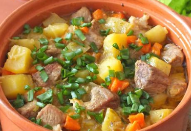 Ингредиенты: На 4 порции: - 650 г говядины - 1,5 кг картофеля - 4 ст. л. сливочного масла - 2 головки репчатого лука - ¾ стакана мясного бульона - 1 стакан сметаны - лавровый лист - соль - перец - зелень петрушки - укроп - 100 г сухого вина Приготовление: Очищенный картофель нарезать кубиками и слегка обжарить в масле. Репчатый лук нашинковать кольцами и обжарить в масле до золотистого оттенка. Говядину, нарезанную небольшими кусочками, слегка обжарить в кипящем масле с обеих сторон. В глиняный горшок, чугунок или в кастрюлю положить мясо, затем положить картофель, сверху лук, посыпать все солью, перцем, положить лавровый лист и добавить бульон. Поставить жаркое в духовку и тушить 30 минут. За 10 минут до окончания приготовления налить сухое вино. Готовое блюдо перед подачей к столу залить сметаной и посыпать мелкорубленной зеленью петрушки и укропом.