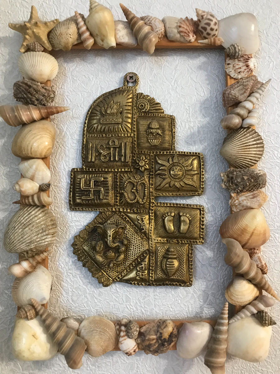 Вводные данные: имеется пустоватая стенка, куда просится что-то небольшое, чуть продолговатое. Картиночка - скучно, инсталляция какая - где-то ее нужно брать, а дома всякого "нужного" материала для рукоделия тьма-тьмущая)). Традиционно, по сусекам поскребла. Ждала своего часа металлическая литая штука со всякими символами. Сразу по поводу свастики. Хотя Германия в войну этот знак испохабила, но он таки древнейший символ движения, благополучия и я его воспринимаю именно так. С этой железкой произошла такая история. Это, похоже, составная штука, сваренная из отдельных элементов. которая очень мне зашла по набору символов. только свастика все же вызывала сомнения. Ехать она с нами из Индии ох как не хотела. Просканировали на границе чемоданчик, спрашивают, что это у Вас? А я по русски-то не объясню, что такое везу в качестве сувенира, а они по русски-то и не поймут, инглиш требуют. В общем, бекала-мекала, всю очередь задержала. А я в железку вцепилась, ни за что на границе не оставлю